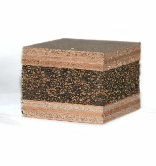 Pannello composito 3 o 2 strati composto da due o un solo strato di compensato marino di Okoumè (anche con omologazione RINA) assemblato a del sughero-gomma con elevato indice di assorbimento di vibrazioni e buon isolamento acustico.